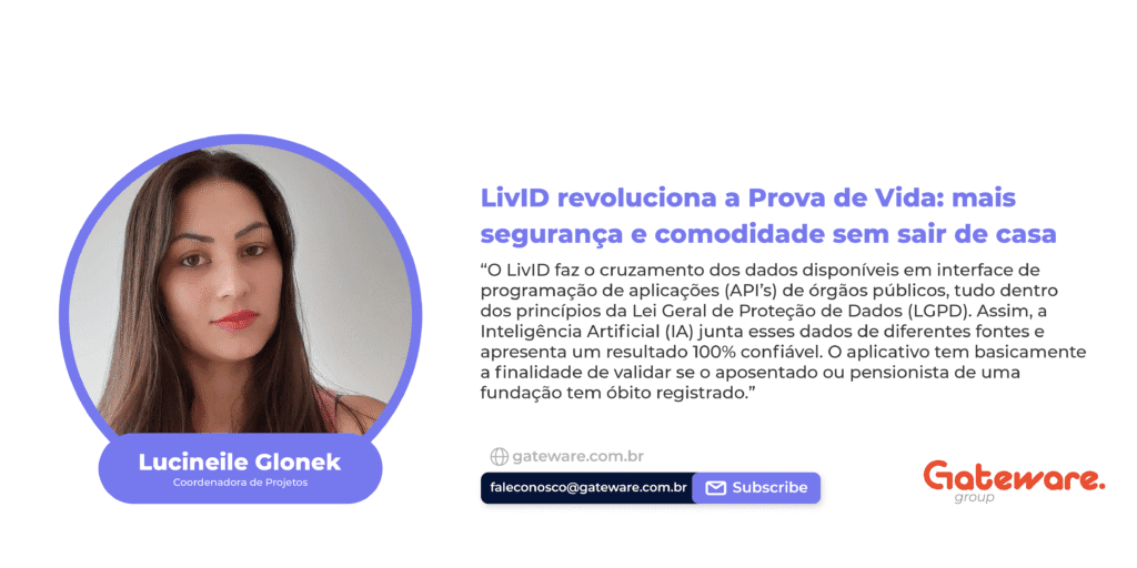 “O LivID faz o cruzamento dos dados disponíveis em interface de programação de aplicações (API’s) de órgãos públicos, tudo dentro dos princípios da Lei Geral de Proteção de Dados (LGPD). Assim, a Inteligência Artificial (IA) junta esses dados de diferentes fontes e apresenta um resultado 100% confiável. O aplicativo tem basicamente a finalidade de validar se o aposentado ou pensionista de uma fundação tem óbito registrado”, explica a Coordenadora de Projetos do GW Solution da Gateware, equipe que desenvolveu o app chamado LivID, Lucineile Glonek.